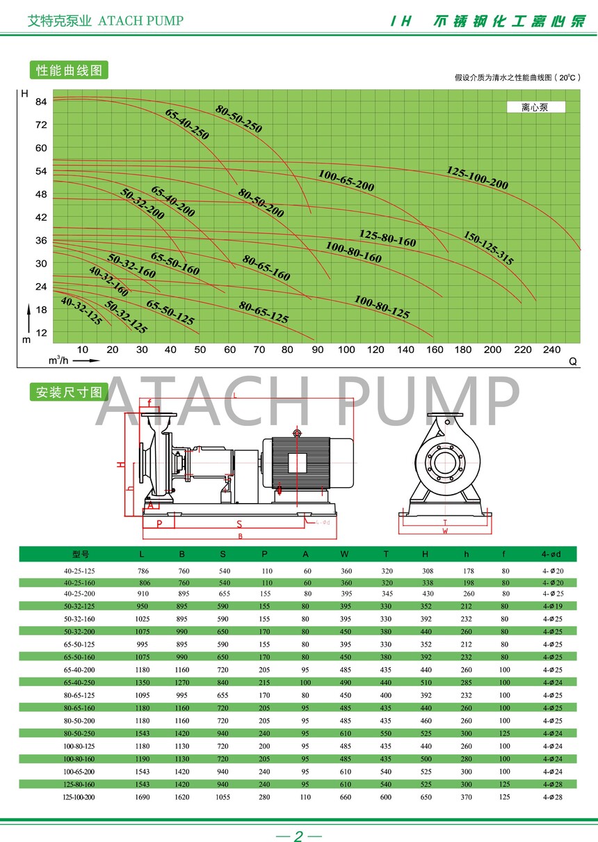 IH type pump is applicable to many industrial fields (such as chemical industry, petroleum, petrochemical industry, metallury, light industry, printing and dying industry, pharmacy, invironment protection, seawater desalination, offshare oil production, paper manufacture, etc.) for the transportation of the Organic or inorganic chemical medium, oil products as well as corrosive liquid which contain no solid granule.