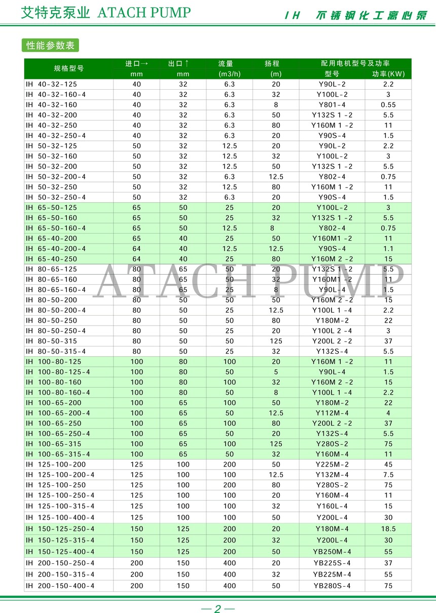 IH type pump is applicable to many industrial fields (such as chemical industry, petroleum, petrochemical industry, metallury, light industry, printing and dying industry, pharmacy, invironment protection, seawater desalination, offshare oil production, paper manufacture, etc.) for the transportation of the Organic or inorganic chemical medium, oil products as well as corrosive liquid which contain no solid granule.